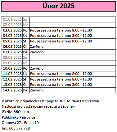V Pátek pouze provádíme malé operační zákroky!! V této době z důvodu objednaných lékařských výkonů nezvedáme telefon, nevydáváme recepty, ani jiná potvrzení!!!
